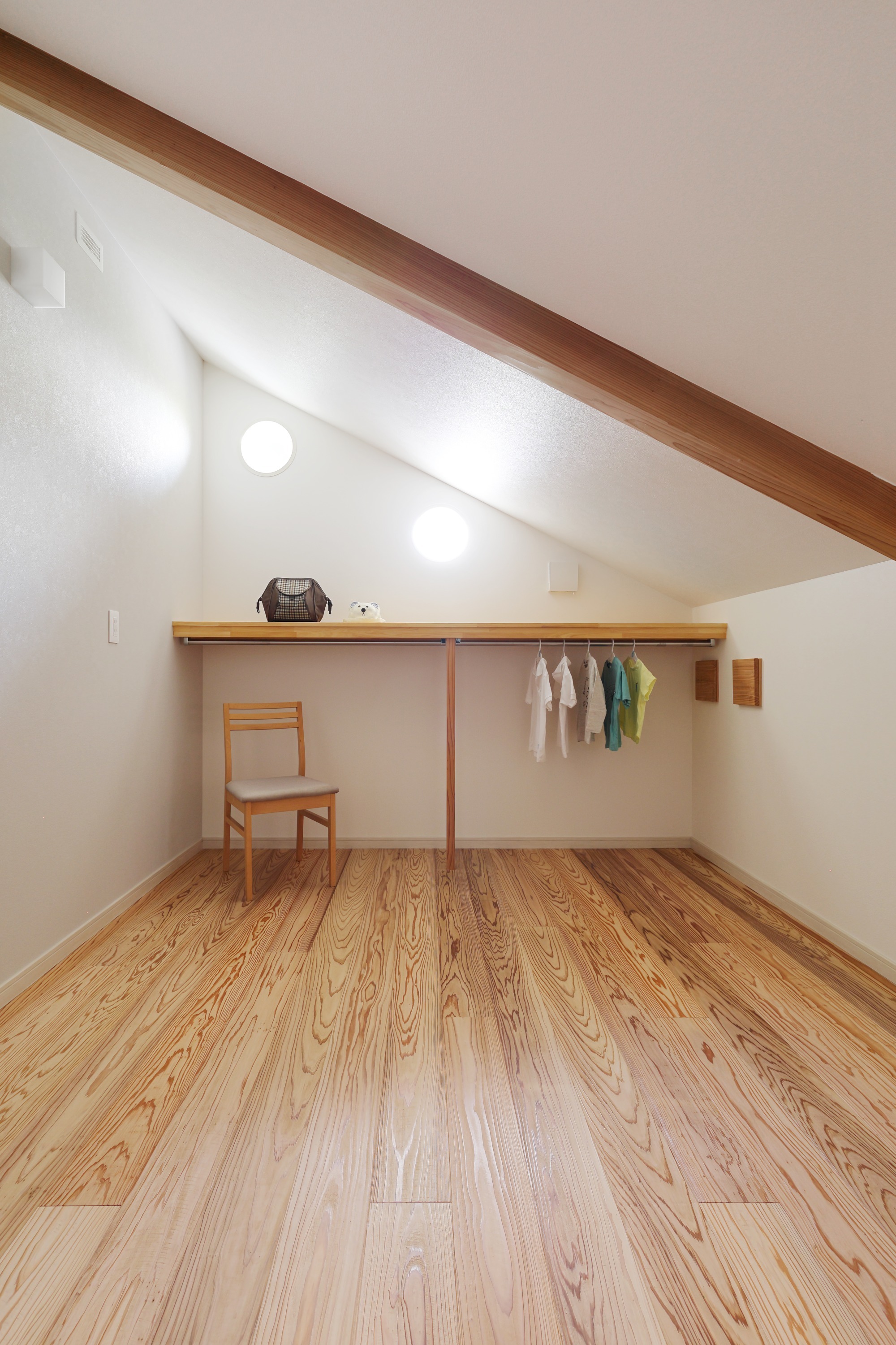 丸窓が印象的な2階納戸。床はうづくり仕上げで裸足が心地いい。