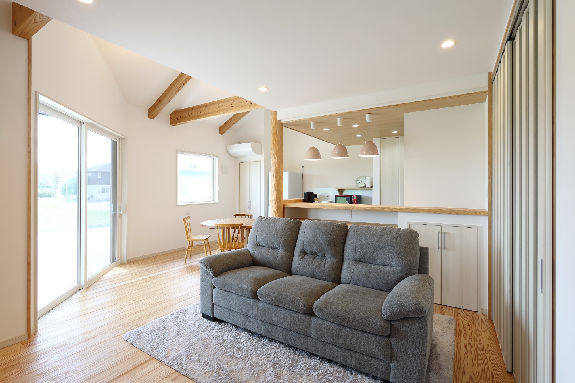 一台のエアコンで快適に過ごせ、家の前に大きなお家があってもリビングが明るく過ごせます。