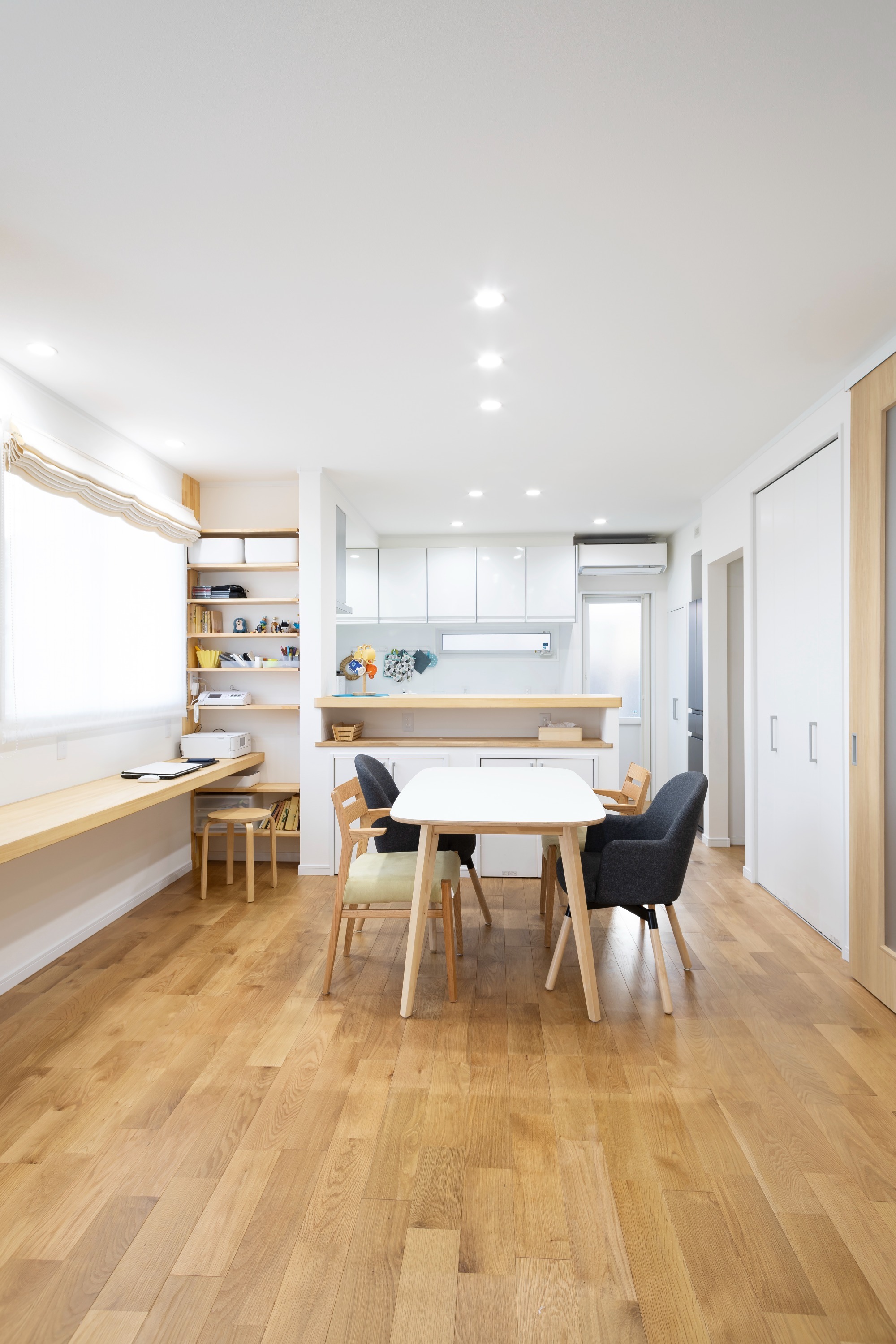 オーク無垢床×白基調の明るいLDKは、子どもを見守りやすい動線設計。