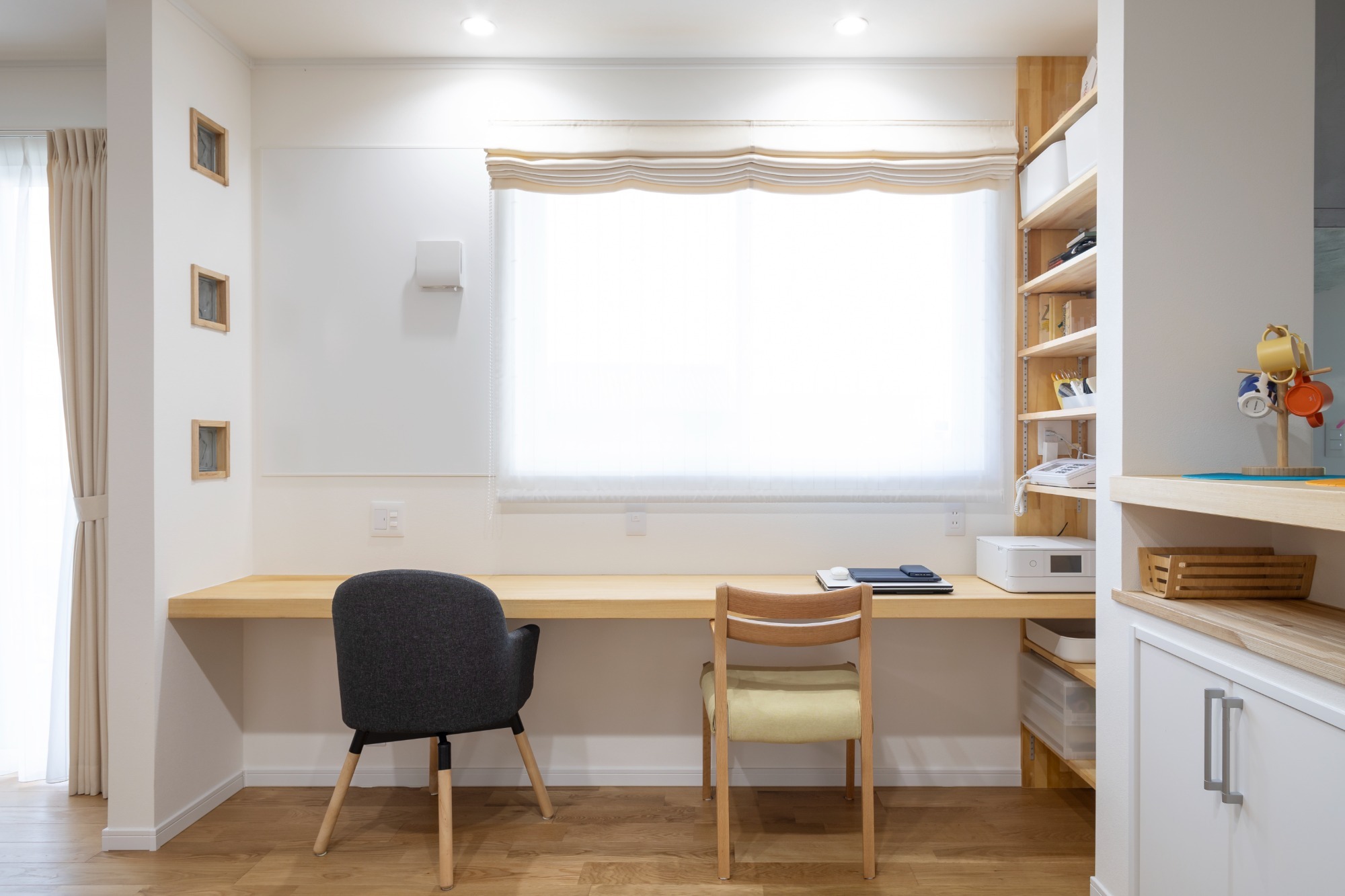 今までの手持ちの食器棚や家具等に合わせてすっぽり収まる形に壁を作っていただいたり、自分の描いた油絵や日本画を掛けたり、主人が撮った写真等を飾るために釘を打てるところをつくって頂いたり、こちらの注文に快く応じて頂きました。