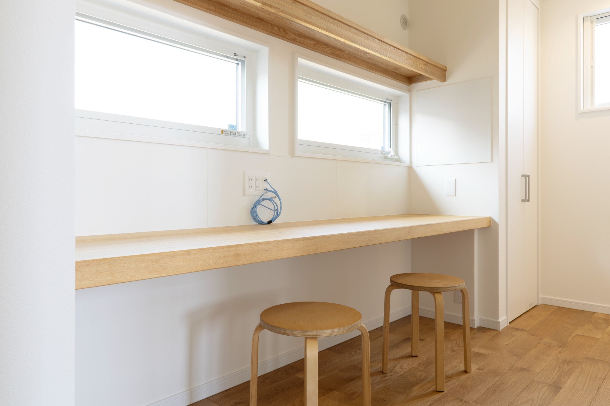 LDKの窓際にカウンターと棚を設置、勉強やPC作業も快適に。